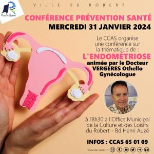 Le CCAS organise mercredi 31 janvier 2024 à 18h30 une conférence prévention santé sur la thématique de L'ENDOMÉTRIOSE animée par le Docteur VERGERES Othello Gynécologue à l'Office Municipal de la Culture et des Loisirs du Robert - Bd Henri Auzé