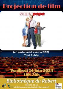 La Bibliothèque municipale vous invite à la projection du film "SUPER PAPA" en partenariat avec la BDP, le Vendredi 14 juin 2024 de 18h à 20h à la Bibliothèque du Robert.