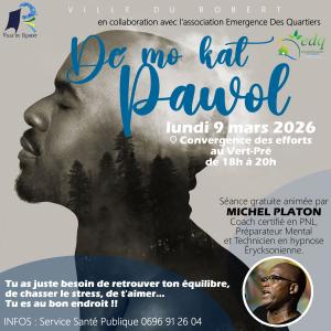 Le service Santé Publique de la Ville du Robert vous invite à participer à son "Dé mo kat pawol" animé par Michel Platon (Coach certifié en PNL, Préparateur Mental et Technicien en hypnose Érycksonienne) le lundi 9 mars 2026 à la Convergence des efforts du Vert-Pré de 18h à 20h.