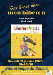 La bibliothèque municipale du Robert vous propose l'animation "DES LIVRES DANS MON BIBERON" pour les enfants de 0 à 4 ans animé par Myrella le samedi 31 janvier 2026 à la bibliothèque de 9h à 10h30.