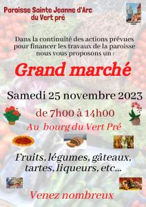 La paroisse Sainte Jeanne D'arc du Vert-Pré organise SAMEDI 25 NOVEMBRE 2023 un grand marché de Noël de 7h à 14h au marché du bourg. Vente de fruits et légumes, tartes, gâteaux et de nombreux produits de Noël.