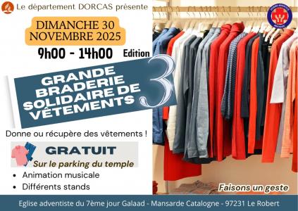 Grande braderie solidaire de vêtements organisée par le département DORCAS sur le parking du temple adventiste Galaad du Robert de 9h à 14h00. Donnez ou récupérez des vêtements.