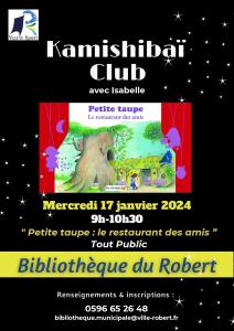 La bibliothèque municipale du Robert vous propose l'animation "KAMISHIBAÏ CLUB" avec Isabelle le mercredi 17 janvier 2024 à la bibliothèque de 9h à 10h30.