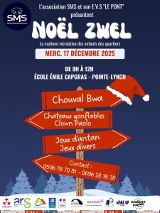 L'association SMS vous invite à la manifestation Nwel Zwel le mercredi 17 décembre 2025 de 9h à 12h à l'école élémentaire Emile Capgras à Pointe Lynch au Robert.