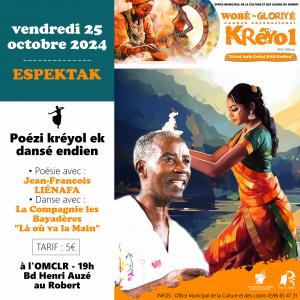 Dans le cadre de la 2ème édition « Wobè ka Gloriyé Kréyol », la ville du Robert et son Office de la Culture vous invitent à participer à Poési kréyol ek dansé endien à 19h à l'OMCLR