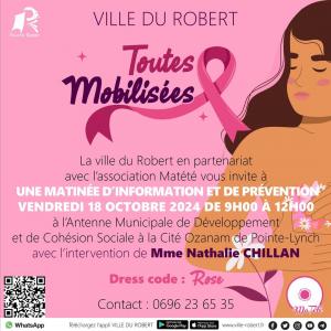 La ville du Robert en partenariat avec l'association Matété vous invite à une matinée d'information et de prévention ce VENDREDI 18 OCTOBRE 2024 de 9H00 à 12H00.