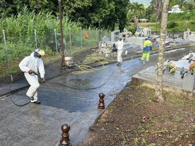 Depuis quelques jours, les équipes des services techniques du Vert-Pré s'affairent pour le nettoyage et des réparations diverses au cimetière du Vert-Pré.