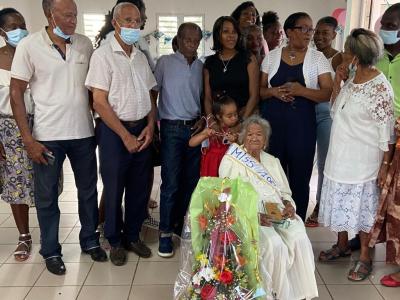Le Jeudi 30 Juin 2022 Mme MANERLAX Émilienne Geneviève Vve BARCLAIS surnommée "Gêgê" à fêté ses 100ans. Elle habite au quartier Duschene, est née le 30 juin 1922 au Robert. 4ème d’une fratrie de 9 enfants. Mère au foyer, elle a eu 12 enfants (2 sont décédés). Sa famille au fil des années s'est agrandi et elle a vu naître ses 30 petits enfants, 33 arrières petits-enfants et 1 arrière arrière petit enfant. Elle fait partie d'un groupe de Rosaire, aime chanter, prier et les mots croisés qu'elle pratique jusqu’à maintenant. Le Maire Alfred MONTHIEUX et une délégation du CCAS du Robert se sont rendus à la Maison pour tous de Duchesne où se tenait une petite fête pour honorer "Gêgê" en ce grand jour pour elle.