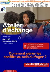 L'association Martinique Jeunesse Solidarité vous invite à son atelier d'échange sur le thème "Comment gérer les conflits au sein du foyer ?" animé par Mme BOROT Murielle (Médiatrice familiale) Mardi 18 novembre 2025 de 17h à 19h à l'école Edgard Labourg à Four à Chaux.