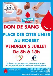 L'Etablissement Français du Sang en partenariat avec le ville du Robert vous convie à sa collecte de sang vendredi 5 juillet 2024 sur la place des Cités Unies au Robert de 8h à 13h.