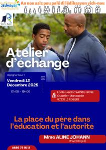 L'association Martinique Jeunesse Solidarité vous invite à son atelier d'échange sur le thème "la place du père dans l'éducation et l'autorité" animé par Mme Aline Johann (Psychologue) vendredi 12 décembre 2025 de 17h à 19h à l'école Hector Sainte-Rose de Mansarde.