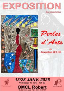 La ville du Robert et son Office de la Culture et des Loisirs vous invitent au vernissage de l'exposition "Perles d'Arts" de Jacqueline MELOS le mardi 13 janvier 2026 à 19h à l'OMCLR.