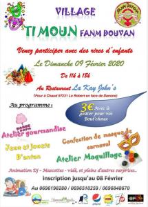 L'association Fanm Douvan vous convie à son village "Ti Moun Fanm Douvan" , le Dimanche 9 février 2020 au Restaurant La Kay John's (Four à Chaux en Face de Danone) de 11h00 à 18h00.